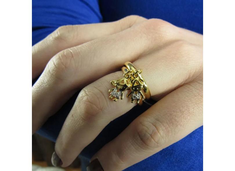 Anel Duplo Folheado a Ouro Liso com Pingente Dois Meninos Cravejado com Zircônia Branca Filhos