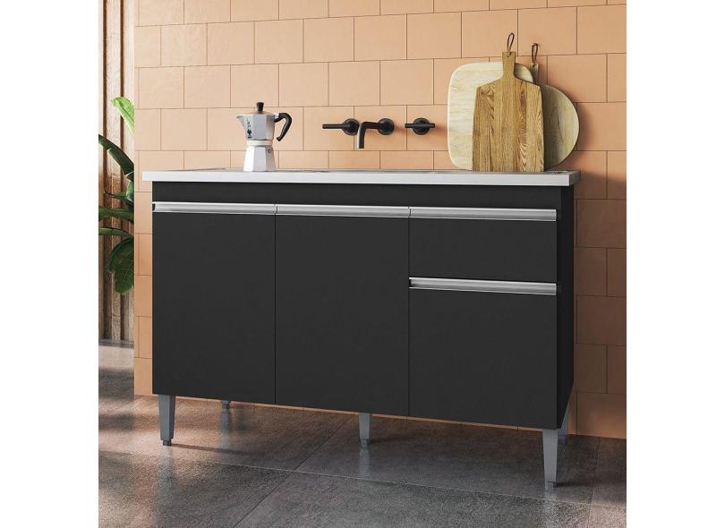 O menor preço encontrado no Brasil para Balcão Gabinete Com Pia Inox 120cm 3 Portas E 1 Gaveta Tatiane Preto - Ajl Móveis atualmente é R$ 710,07.