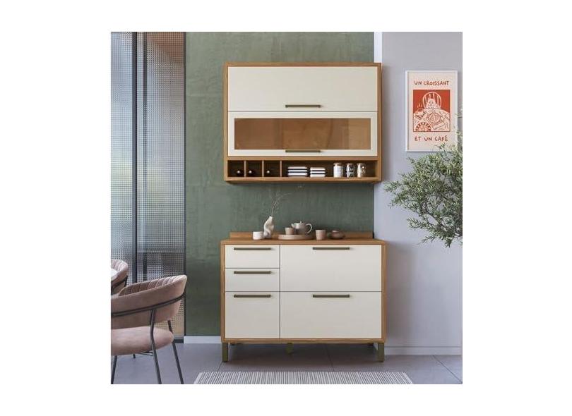 Cozinha Compacta 120cm com 2 Peças Vidro Reflecta e 3 Gavetas 100% Mdf Vicenza Espresso Móveis Amêndoa/Off White