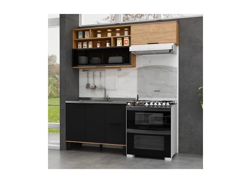 Cozinha Modulada 3 Peças Mdf com Aéreo 1200cm Porta de Vidro Basculante Toscana Freijó/Nero