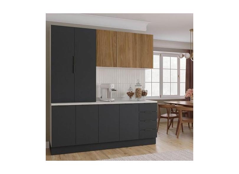 Cozinha Modulada 4 Peças com Tampo com Rodapé 2 Aéreos e 2 Balcões Ipanema CabeCasa MadeiraMadeira Grafite Trama/Acácia