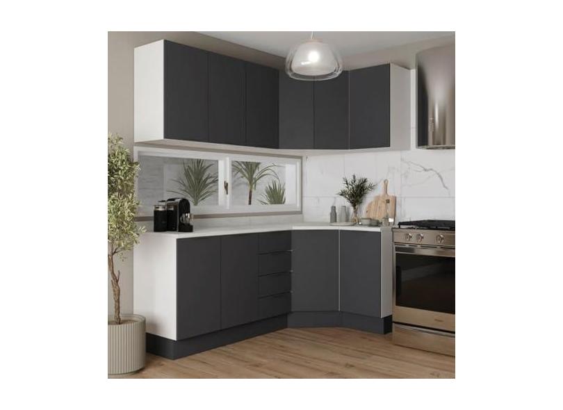 Cozinha Modulada 6 Peças com Tampo e Rodapé 3 Aéreos e 3 Balcões Ipanema Cabecasa Madeiramadeira Grafite Trama