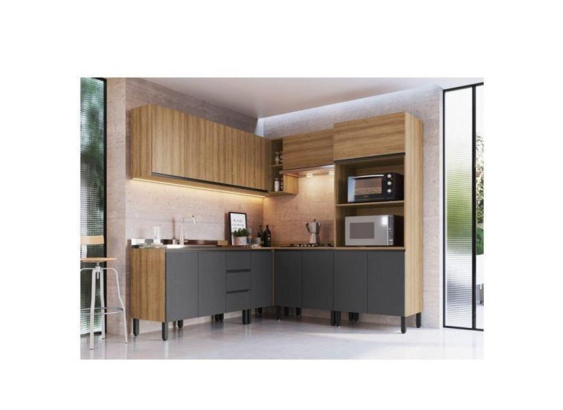Cozinha Modulada 9 Peças Tampo Aéreo 3 Portas Balcão Canto Paneleiro Angico Quiditá Montana/Grafite