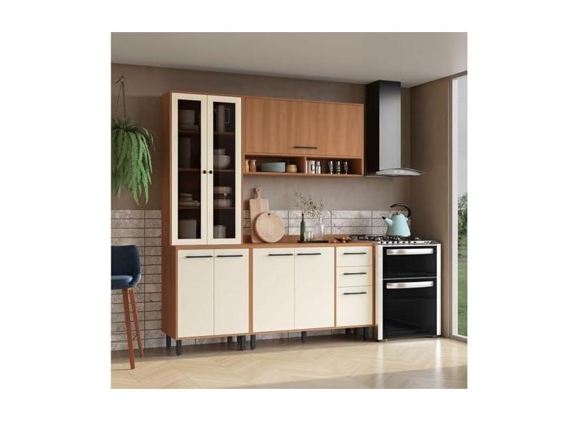 Cozinha Modulada Havana 3 Peças com Tampo e Cristaleira 08 Portas e 2 Gavetas Rovere/Champanhe
