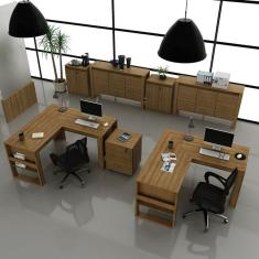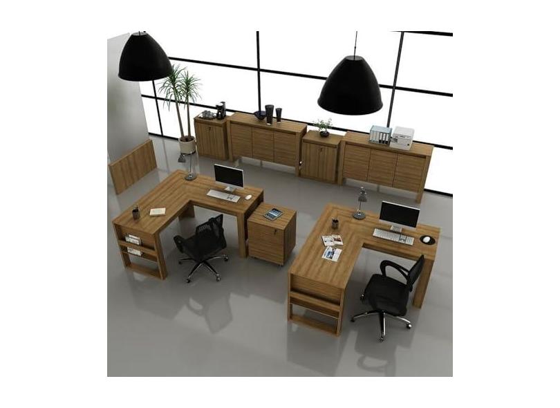 Kit 7 Peças 2 Mesas L com 1 Gaveteiro 2 Balcões e 2 Balcões 3 Portas Espresso Móveis Amendoa