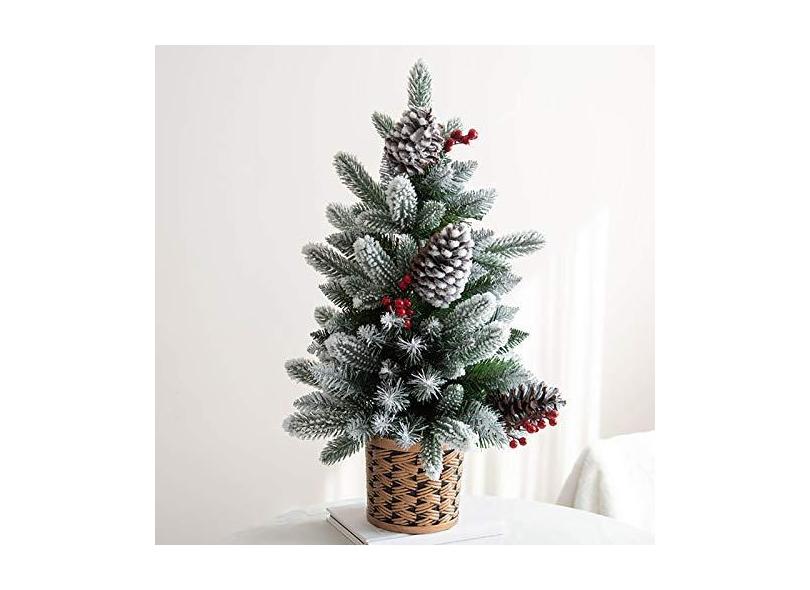 Árvore de Natal de pinho artificial de mesa para decoração de casa e escritório, mini árvore de Natal, pequena árvore de Natal flocada de neve com pinha e frutas vermelhas com base de estopa -