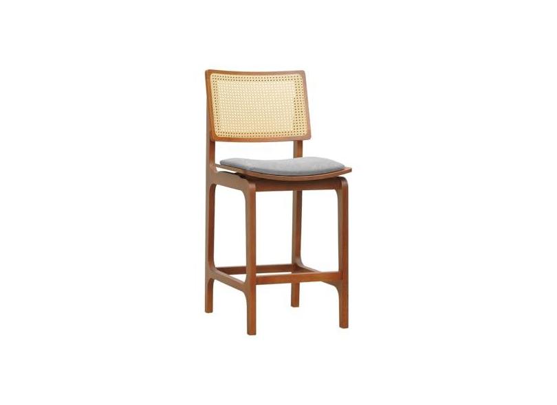 Banqueta Alta Bistrô Gus Madeira Maciça Encosto Telinha Assento Anatômico Linho Impermeável Amêndoa/Cinza