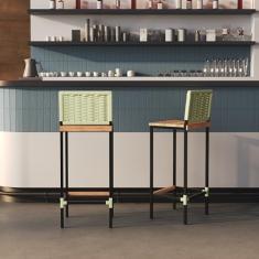 Banqueta Alta em Aço com Assento de Madeira Maciça Encosto de Junco Verde Militar