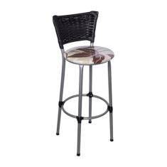 Banqueta Alta Prata com Encosto Junco Preto Assento Floral Marrom