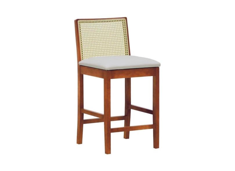 Banqueta Média Pérola com 62cm Altura Madeira Maciça Encosto Telinha Assento Estofado Sintético Amêndoa/ Bege