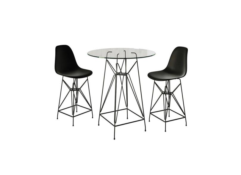 Jogo Mesa Bistrô Eames Eiffel Vidro 60cm 2 Banquetas Preta Base Ferro Preto