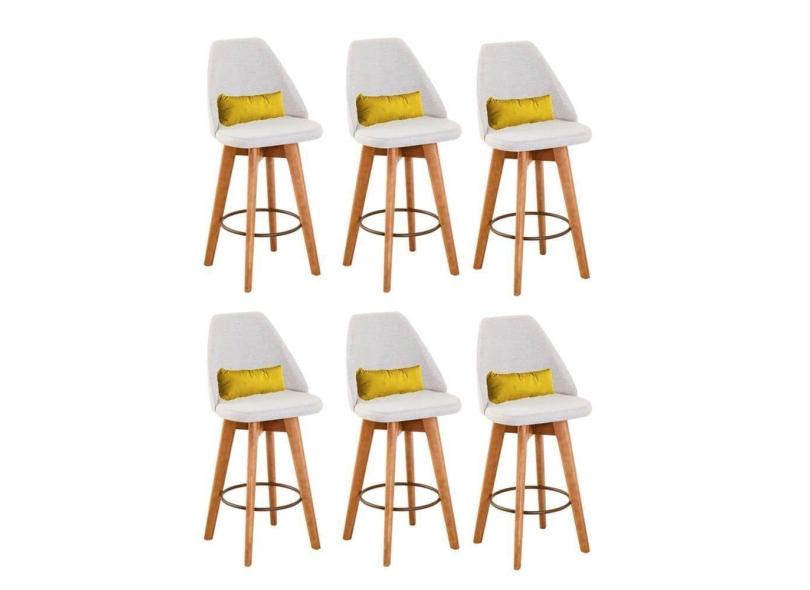 Kit 06 Banquetas Com Encosto Bege Claro E Almofada Amarelo