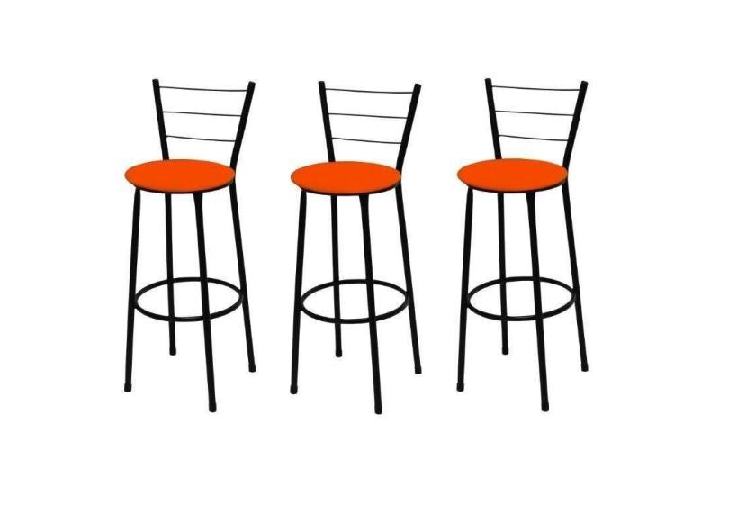 Kit 3 Banquetas Altas Preta com Encosto Assento Laranja