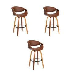 Kit 3 Banquetas Nicole Marrom PU Base Madeira - Rivatti