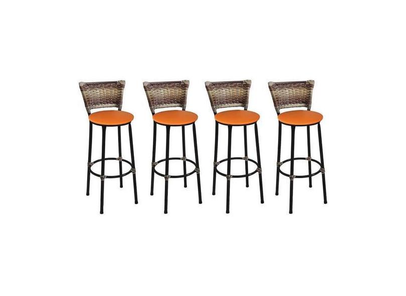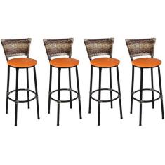 Kit 4 Banquetas Altas Preta com Encosto Junco Capuccino Assento Laranj