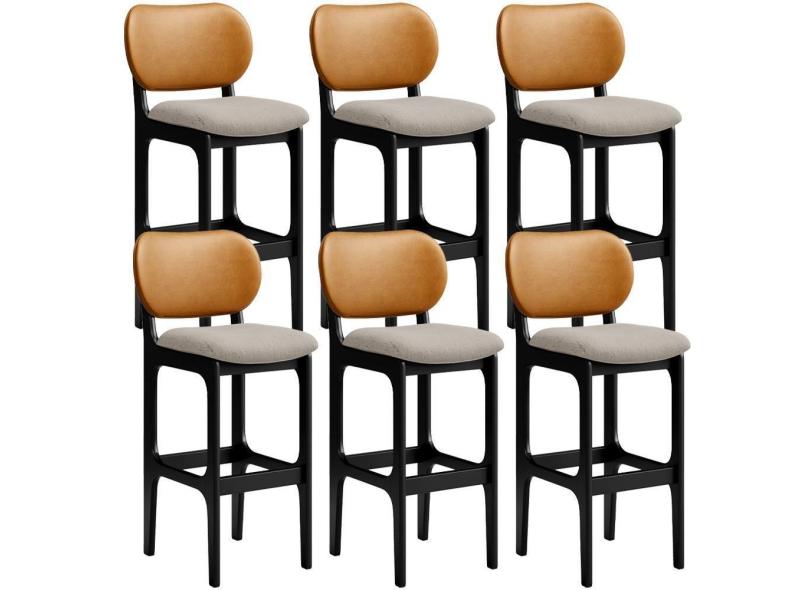 Kit 6 Banquetas Alta Betta Preto Whisky Linho Bege