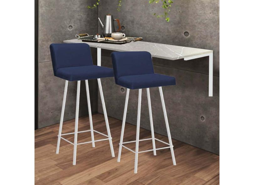 Kit Mesa Suspensa de Parede Fixa MDF Marmorizado + 2 Banquetas Lexi Ferro Branco Sintético Azul Marinho - Ahazzo Móveis
