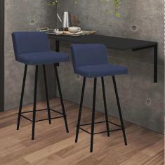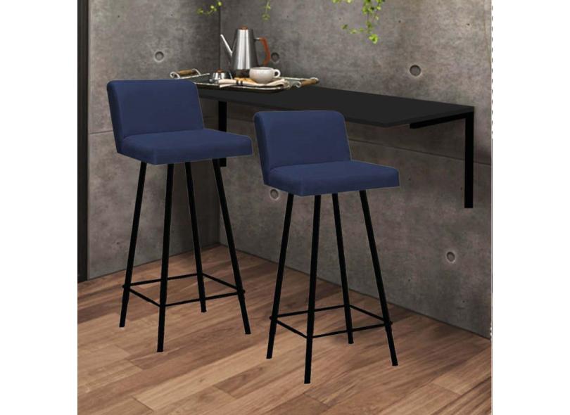 Kit Mesa Suspensa de Parede Fixa MDF Preto + 2 Banquetas Lexi Ferro Preto Sintético Azul Marinho - Ahazzo Móveis