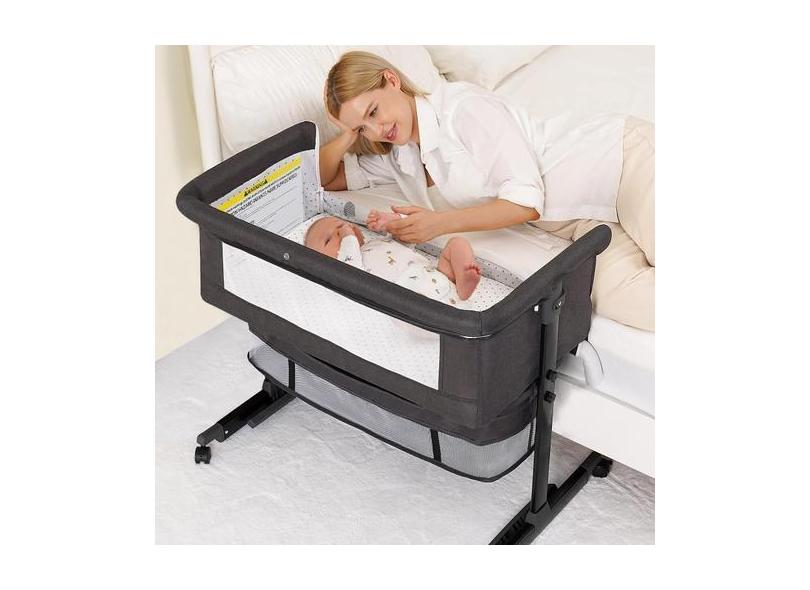 Berço de bebê Semphis 3 em 1, dorminhoco de cabeceira com rodas, cinza