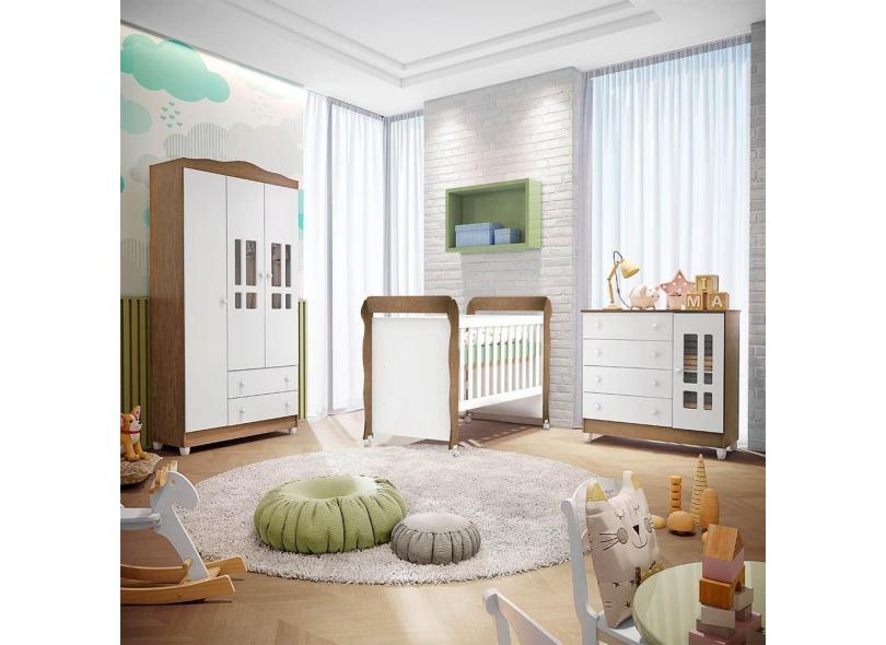 Quarto de Bebê Ariel Completo Berço Mini Cama Mirelle Guarda Roupa 3 Portas Cômoda Infantil Branco Amadeirado Carolina Baby