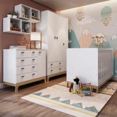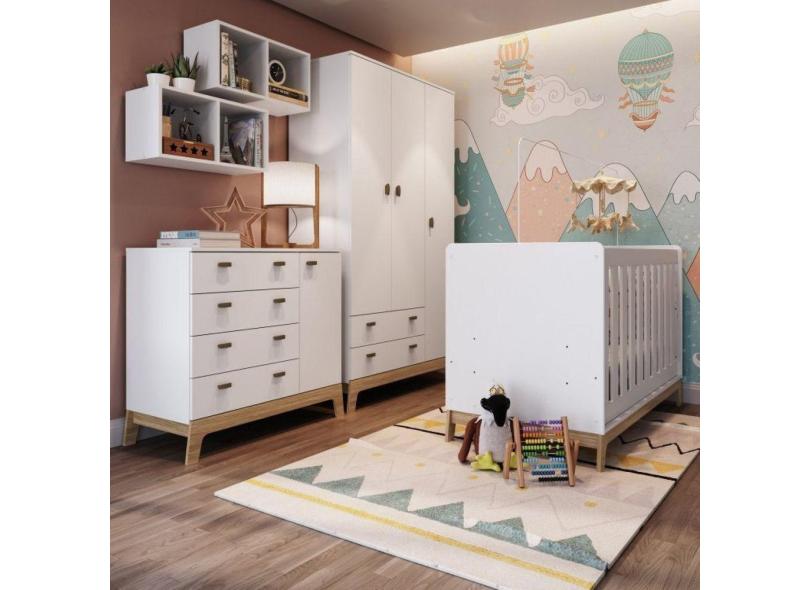 Quarto de Bebê com Berço 3 em 1 Cômoda Guarda Roupas e Nichos Duplos Favo de Marrom Completa Móveis Branco