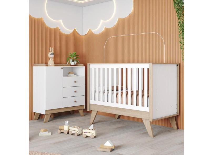 Quarto de Bebê com Berço 3 em 1 e Cômoda 3 Gavetas 1 Porta Retrô Theo Espresso Móveis Branco/Jequitibá HP