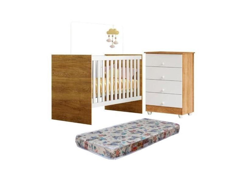Quarto de Bebê com Berço com Colchão Suporte Life e Cômoda de Bebê 100% Mdf 4 Gavetas Soft Life Branco/madeirado Ypê