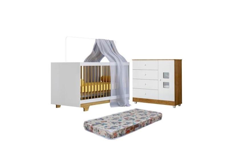 Quarto de Bebê com Berço Mini Cama com Colchão Flocos e Cômoda 100% Mdf 1 Porta 4 Gavetas Life Branco/madeirado Ypê