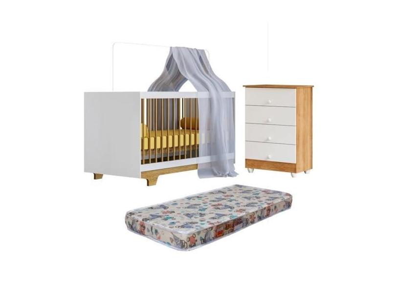 Quarto de Bebê com Berço Mini Cama com Colchão Flocos e Cômoda de Bebê 100% Mdf 4 Gavetas Soft Life Branco/madeirado Ypê