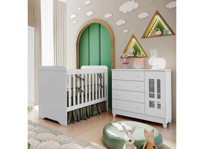 Quarto de Bebê Cômoda 4 Gavetas com Porta Ariel Berço 3 em 1 Gabrielle Branco Brilho Carolina Baby