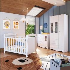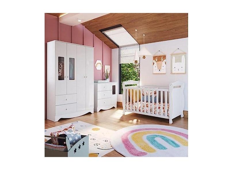 Quarto de Bebê Cômoda Guarda Roupa com Janelas Retângulo e Berço Americano Cocada Branco Brilho
