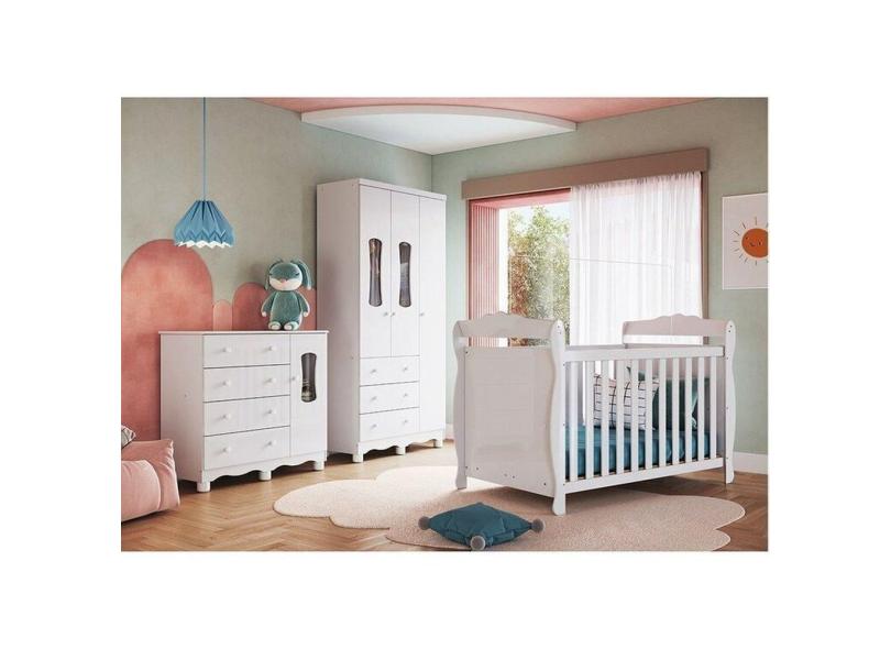 Quarto de Bebê Completo Guarda Roupas Cômoda com Janelas e Berço 100% Mdf Aurora Espresso Móveis Branco Brilho