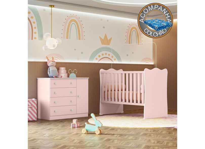 Quarto de Bebê Doce Sonho com Cômoda 2561 e Berço Simples 1 Qmovi Rosa Acetinado + Colchão Ortobom