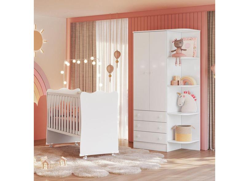 Quarto de Bebê Doce Sonho com Roupeiro 825 e Berço Simples 1 c/ Rodízios Qmovi Branco