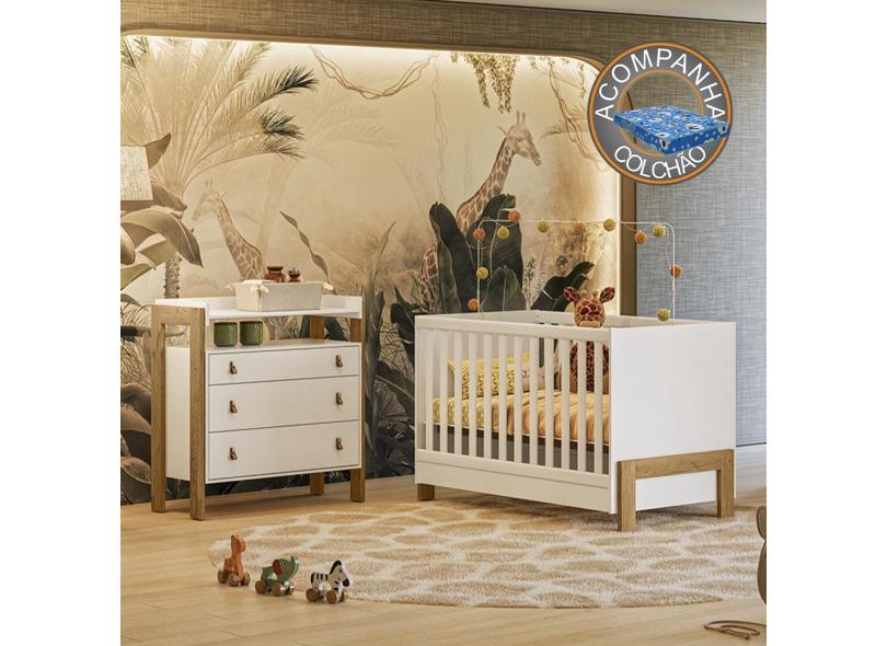 Quarto de Bebê Fantasia com Cômoda 4410 e Berço 4300 Qmovi Branco Acetinado + Colchão Ortobom