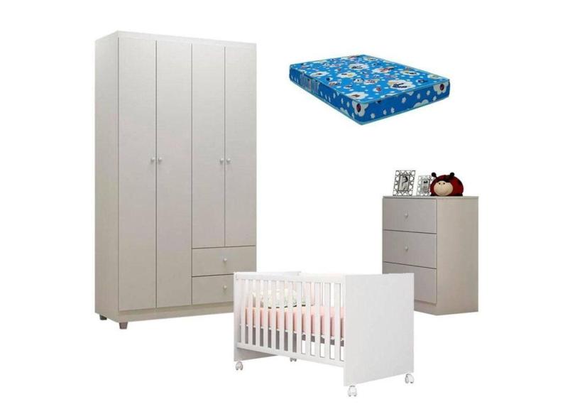 O menor preço encontrado no Brasil para Quarto De Bebê Louise 4 Portas Com Berço Doce Sonho 100 Rodízios Branco Brilho E Colchão - Ajl atualmente é R$ 1.219,41.