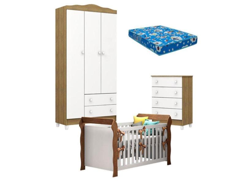 O menor preço encontrado no Brasil para Quarto De Bebê Mel Flat E Berço Americano Lara Branco Acetinado Amadeirado Com Colchão Ortobom atualmente é R$ 1.237,56.