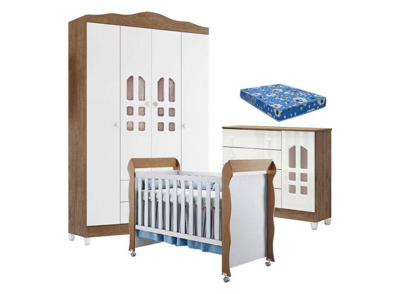 Quarto de Bebê New Selena 4 Portas com Cômoda Selena e Berço Mirelle Branco Acetinado Amadeirado e Colchão Ortobom - Carolina Móveis