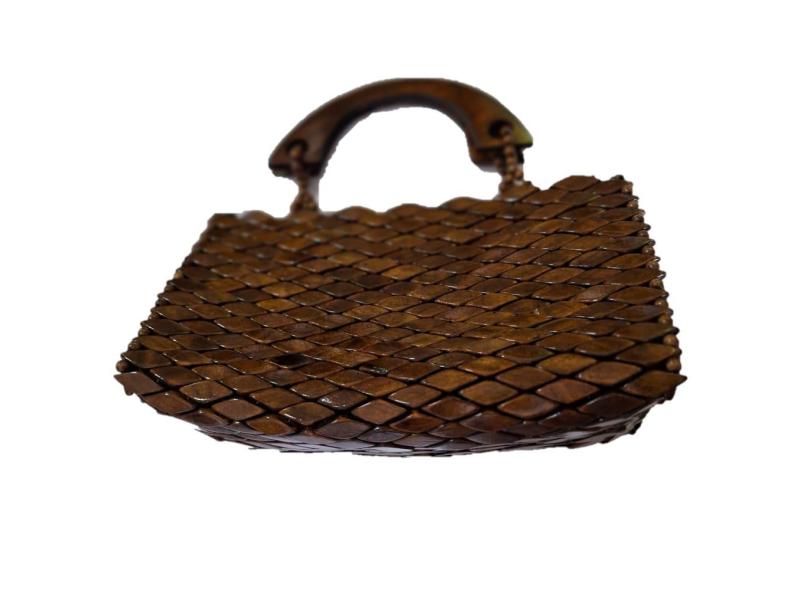 Bolsa Artesanal Peças Madeira Envernizada Marrom, Alça Curta
