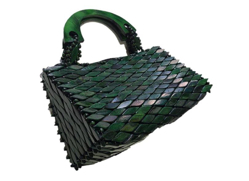 Bolsa Artesanal Peças Madeira Envernizada Verde, Alça Curta