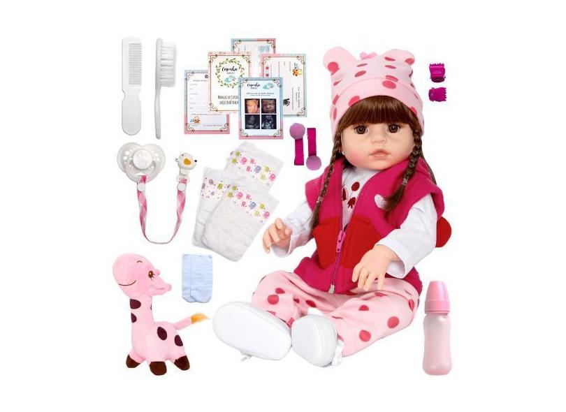 Bebe Boneca Reborn Cabelo Castanho Girafa 22 Itens Com Bolsa - Cegonha