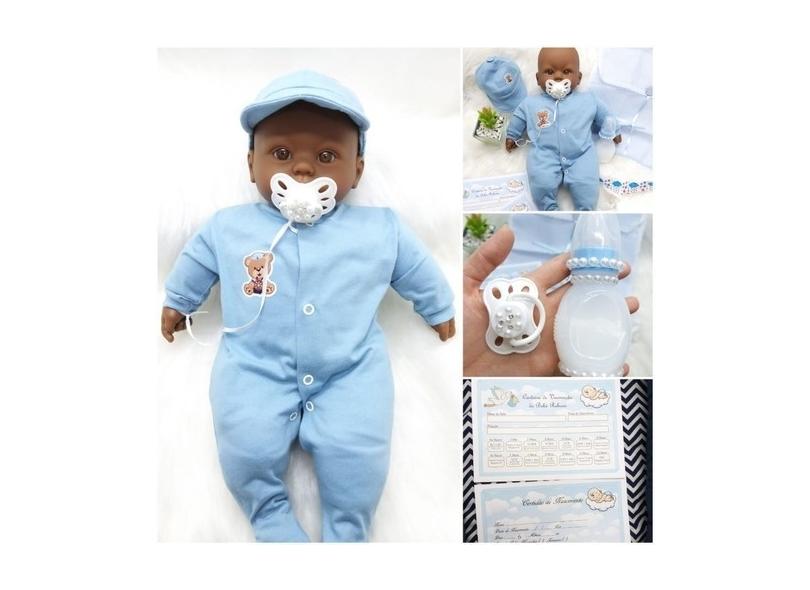 Boneca Bebe Negra Menino Reborn Traços Reais Com 11 Itens