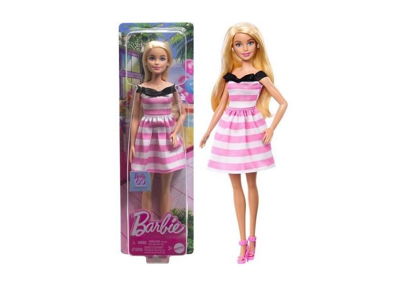 Boneca Articulada Barbie Vestido Listrado Rosa E Branco Com Laço Preto