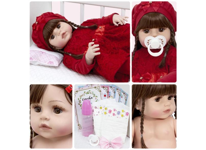 Boneca Bebe Reborn Menina Realista Vestido Vermelho e Itens