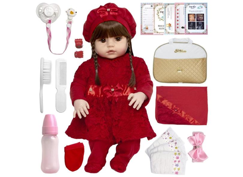 Boneca Bebe Reborn Vestido Vermelho Olho Castanho Princesa