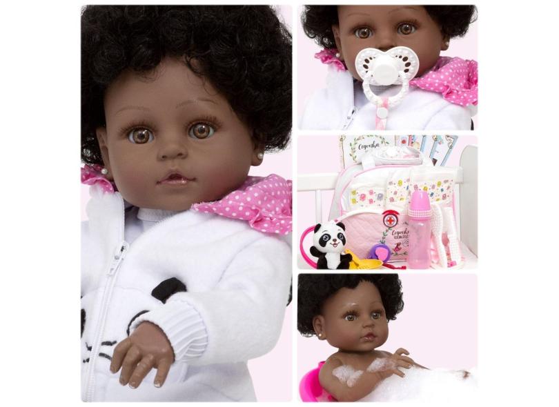 Boneca Estilo Reborn Pretinha Roupa Panda Baby Luxo Acessórios