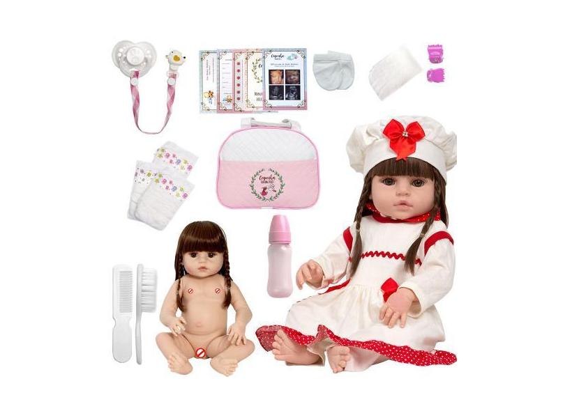 Boneca Reborn Cabelo Longo Castanho Pode Dar Banho + Itens - Cegonha R