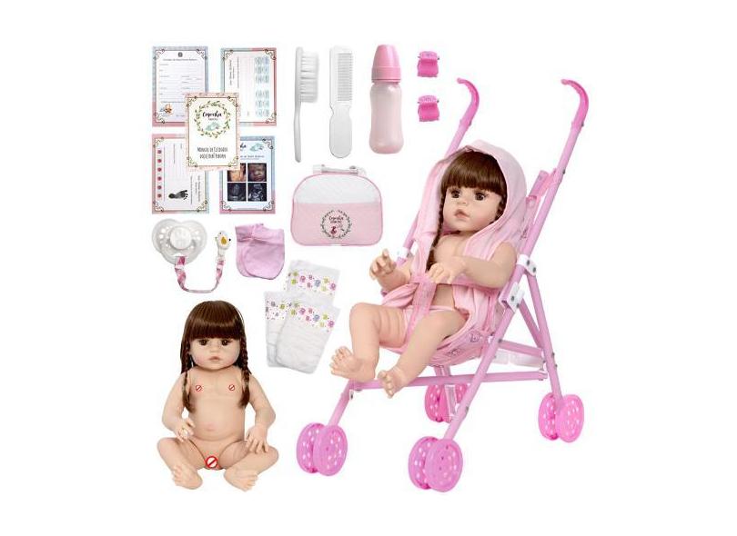 Boneca Reborn Com Roupão Carrinho Criança Passeio - Cegonha Reborn Dol
