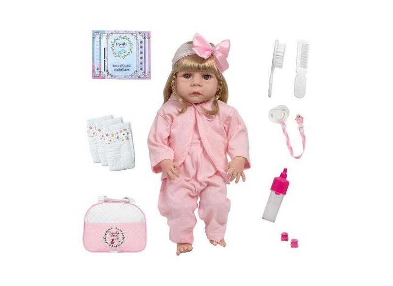 Boneca Reborn Gatinha Loira Cabelo Comprido Com Vários Itens - Cegonha