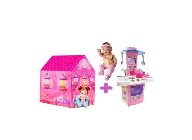 Boneca Reborn Infantil Macia + Barraca E Cozinha Casinha - Dm Toys Mil